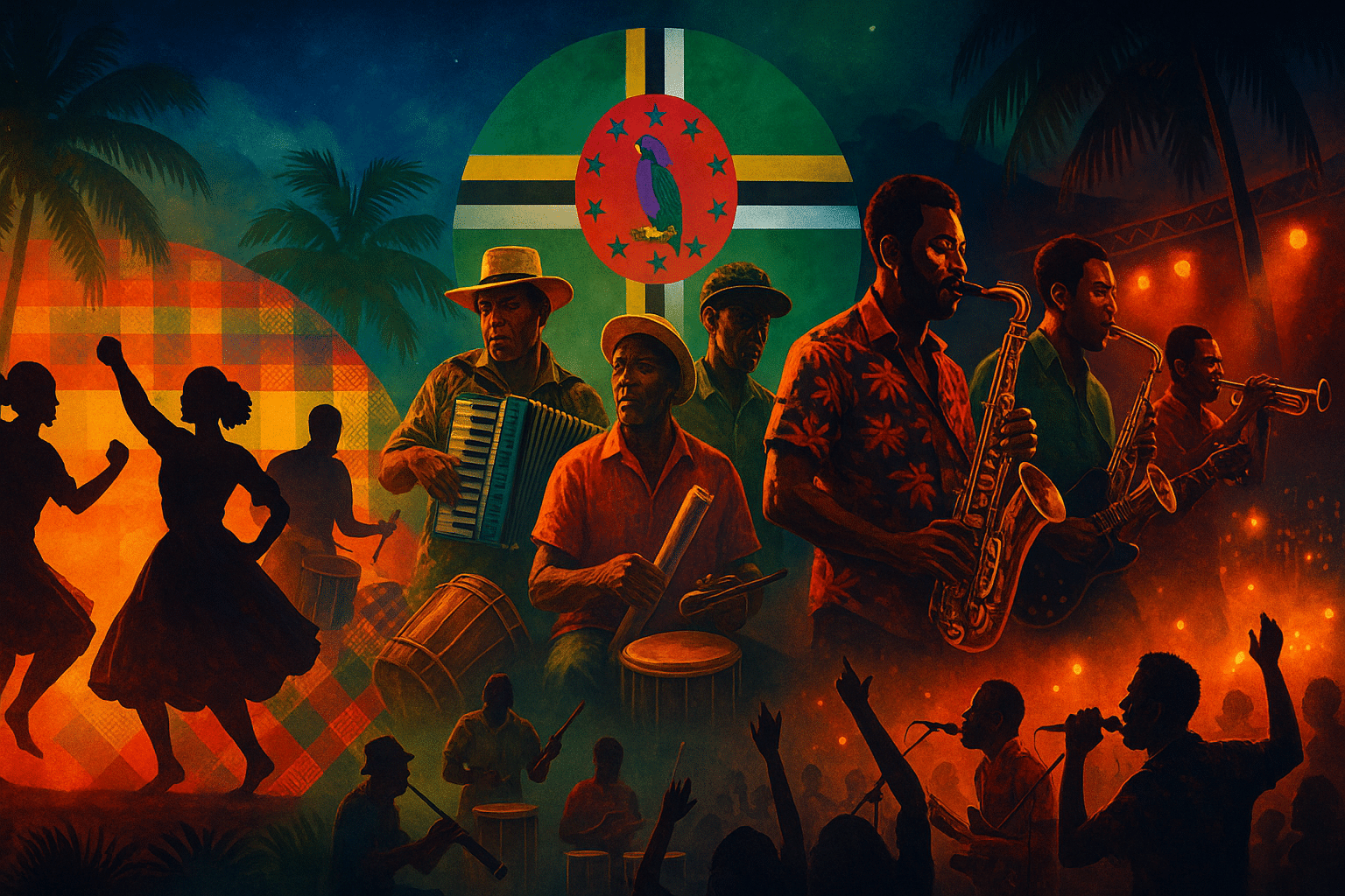 Calypso: By 1959 Dominica crowned its first Calypso King; steelbands flourished, and Carnival stages embraced calypso alongside traditional forms.